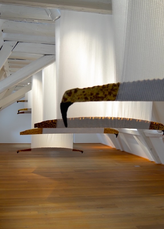 "Selbst-Vor-Stellung", Wand-Boden-Installation aus verhäuteten Sägeblättern in Ausstellung "Camera Miracula", Engländerbau Vaduz, FL