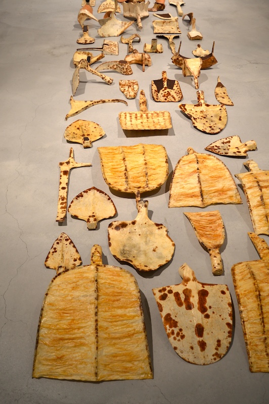 "Selbst-Vor-Stellung", Wand-Boden-Installation aus verhäuteten Sägeblättern in Ausstellung "Camera Miracula", Engländerbau Vaduz, FL